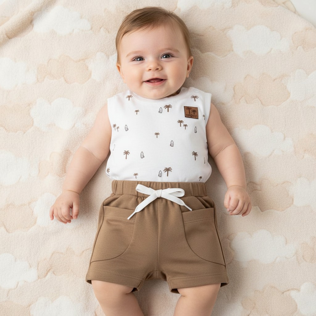 O Conjunto Bebê Praia & Coqueiros combina uma regata leve em tom off‑white com detalhes caramelo e estampa de coqueiros e pranchas, criando um visual descontraído e suave. A modelagem da regata oferece conforto térmico e facilidade de movimento, ideal para dias mais quentes ou momentos de lazer.