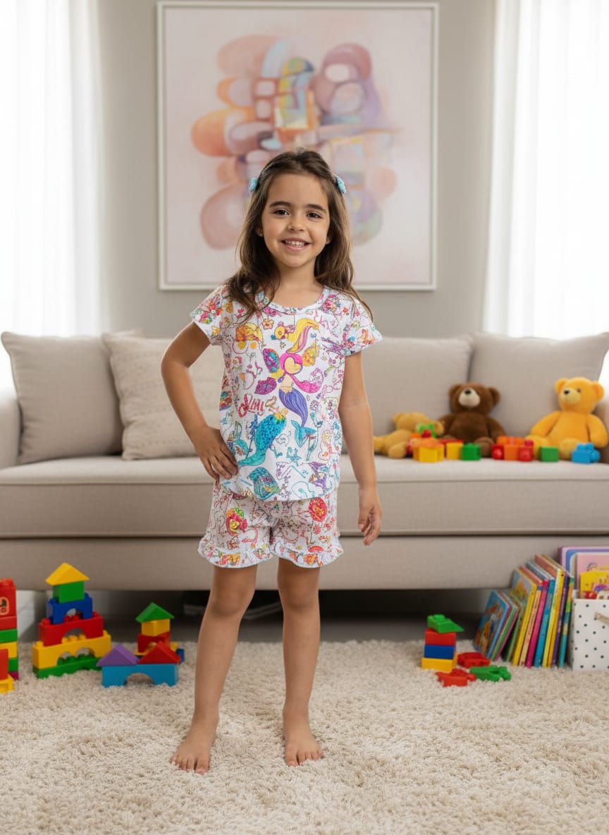 OPÇÃO 2 — DIVERSÃO INFINITA • 1 Pijama "Arte do Soninho" (Blusa e Bermuda) 100% Algodão • 1 Kit com 6 canetinhas hidrográficas laváveis, seguras para crianças.
